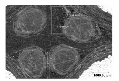 截取一段固化的试样进行CT扫描,截面宏观照片如图12所示,局部放大照片如图13所示。试样内部被树脂完全填充,仅在导体圆角附近存有少量微小空隙,大小约为100~200μm。图13中圆形部分为玻纤带,用于填充导体圆角间的空腔。空腔内可能存有少量空气,导致空隙。