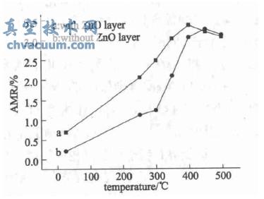 为研究基片温度对插入ZnO层的坡莫合金薄膜AMR的影响,在不同基片温度下制备了一组Ta(4nm)/ZnO(2nm)/Ni81Fe19(20nm)/ZnO(2nm)/Ta(3nm)的薄膜样品,其中基片温度T分别取室温(25℃)、250,300,350,400,450,500℃。图4是不同基片温度下坡莫合金薄膜AMR值的变化曲线,其中a曲线为插入ZnO层的薄膜Ta(4nm)/ZnO(2nm)/Ni81Fe19(20nm)/ZnO(2nm)/Ta(3nm);b曲线为未插入ZnO层的薄膜Ta(4nm)/Ni81Fe19(20nm)/Ta(3nm)。