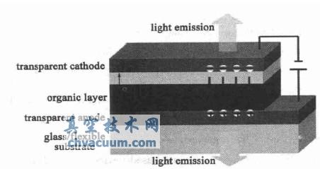 特别是近些年来,透明式的有机光电器件(Transparentorganic-baseddevice)备受关注(如透明OLED,见图1),其优势在于当不显示信息时面板是半透明的,显示时两面都可以接收到信息。在透明式有机光电器件中,要求阴极材料必须透明导电,虽然很薄的金属薄膜可以满足要求,但常常会遇到断路或金属氧化等问题,所以使用透明导电氧化物薄膜作为阴极材料是最佳选择。采用电子束蒸发法可以实现在有机衬底上沉积质量较好的透明导电薄膜,但是需要控制束流大小和密度,还需要将衬底加热到150oC。因此,在有机材料层上磁控溅射这种沉积过程中对有机材料的损伤和温升直接影响沉积透明导电氧化物薄膜是比较通用的方法,但传统的磁控溅射技术由于衬底面向靶材表面(即靶材与有机物衬底平行),等离子体处于靶材和衬底之间,具有一定能量的荷能粒子如反射原子(氩原子、氧原子)、溅射原子、二次电子和氧负离子等直接对有机物衬底轰击,容易产生静电损伤、离子轰击损伤、紫外光辐射损伤、等离子体热辐射损伤等问题,同时也会引起衬底温度的升高(见图2)。