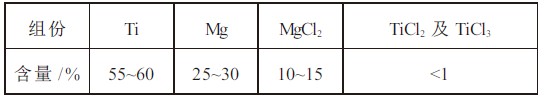 镁热法制备海绵钛还原产物的真空蒸馏设备分为“I”型半联合炉和倒“U”型联合炉。“I”型炉的设备的特点是在还原反应器大盖上设有盲板,在还原反应结束后,趁热量未散失时将蒸馏装置组装起来进行蒸馏作业。而倒“U”型炉的特点则是反应器与冷凝器通过附有加热和保温装置的连接管连接,连接管道上设有阀门,还原反应结束后,打开阀门,开始蒸馏操作。“I”型半联合炉相对于倒“U”型联合炉结构简单、易操作,在国内应用较广泛。目前国内“I”型半联合炉单炉产能以达到7.5 吨/ 炉。还原工序所得的产物中各组份含量如表4所示。