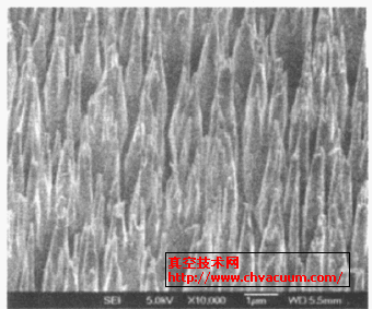 图2 展示了无氧铜样品表面的扫描电子显微镜照片,它显示的是一个没有处理过的高导无氧铜表面1000 倍的照片,放大后的照片说明表面并不十分光滑,是研究中包含的其他样品基底未做离子处理前的模样。图3 显示了离子表面改性后织构的形貌,毛刺的高度在3~15μm 范围内,密度大于等于5 ×107 / cm2 。图4 显示了低温150 ℃时,正常工艺参数下收集极表面几乎未能形成毛刺。因此,样品温度在毛刺的形成过程中起到重要的作用,过低的样品温度不能形成所需要的毛刺织构。