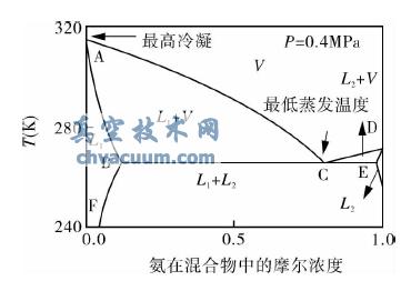 L.液体;V.气体;1.丁烷;2.氨由图3分析得氨最高的冷凝温度为316K,氨气能被吸收剂完全吸收,制冷剂正丁烷能够被冷却水完全冷凝。由图还得知,NH3-C4H10二元工质的共沸点为267K,该温度即为系统的最低蒸发温度。
