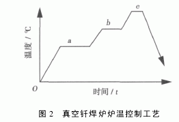 (4)真空钎焊:对真空钎焊炉抽真空后进行三个阶段的加热、保温,其工艺曲线如图2所示。即:第一阶段(a)预热定温、保温;第二阶段(b)蓄能定温、保温和第三阶段(c)钎焊定温、保温;停电。待炉温降至规定温度出炉。