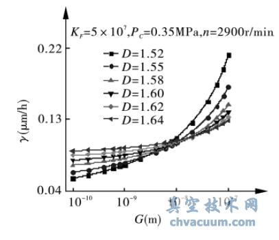 当取端面比压pc = 0.35MPa、转速n = 2900r /min 时,端面轮廓分形参数D 和G 对软质环端面磨损率γ 的影响如图6 和图7 所示。
