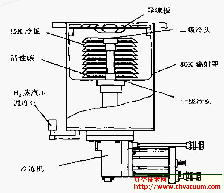 主要用来凝缩排除水蒸气(H2O)、有机物(CO2) 等的气体分子, 并用来防止热辐射直接进入辐射罩。通常, 在80K温度下,入射水分子的温度即使在室温, 凝缩系数也接近于1。因此, 水分子几乎全部被凝缩, 所以, 冷凝泵对水的排除是最理想的。