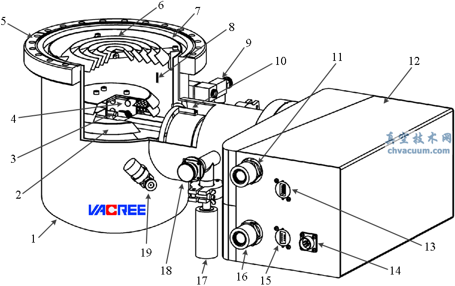 1-泵壳;2-二级冷板;3-二级加热器;4-二级温度传感器;5-安装法兰;6-一级冷板;7-防辐射屏;8-一级温度传感器;9-粗抽阀;10-一级加热器;11-氦气进;12-控制箱体;13-远程监控接口;14-电源接口;15-手操器接口;16-氦气出;17-真空计;18-航空芯座;19-吹扫阀;