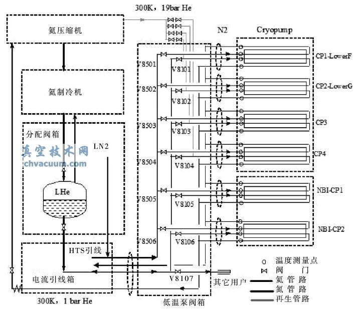 EAST(Experimental Advanced Superconductive Tokamak)全超导托卡马克装置是中国科学院等离子体物理研究所承担的国家/九五0大科学工程。试验放电期间为了防止杂质从偏虑器靶板附近进入等离子体核心,为EAST长脉冲放电实验提供持续的排灰能力以及偏虑器的等离子体的密度控制,低温冷凝泵是不可缺少的部件之一。低温泵的工作原理是低温下的气体冷凝作用、冷捕集作用及低温吸附作用,它具有真空度高、抽速大,对大多数气体无选择性,形状任意、高度清洁、工作压强范围宽,被认为是大体积容器抽超高真空较好的一种方法,低温冷凝泵冷凝板的工作温度为4.5~20K,为了满足低温泵的运行条件,专门设计了内置低温泵分配阀箱,阀箱低温分配流程图见图1。由EAST低温系统提供液氦和液氮冷却,整个实验过程需要计算机自动监控,在原有低温控制系统的基础上,扩展设计了内置低温泵监控系统,实现了整个实验过程的监控以及数据曲线实时显示。