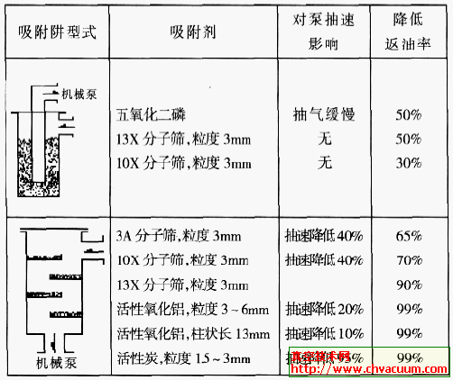 在真空系统的前级管路上设置吸附阱,用吸附剂捕获机械泵的返流油蒸气,是防止机械泵油污染真空系统的简便方法。吸附剂靠物理吸附或化学吸附捕获油蒸汽分子。常用的吸附剂有:五氧化二磷、分子筛、活性氧化铝、活性碳等,各种吸附剂的挡油效果见表2。