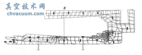 由于叶轮上叶片众多,为简化计算分析过程,将叶片模态分析与转子整体模态分析分开进行。在进行叶片模态分析时,把叶轮上各层叶片均简化为固结于无限大基础上的悬臂梁,分别进行模态分析,所得频率分别约为330,370 及730 Hz。在对转子进行整体建模时,把叶轮换为一个无叶片的模拟轮,此模拟轮与真实叶轮有相同的重心位置及转动惯量参数。在安装了模拟轮的转子上,可分析分子泵转子的整体动力学模态。