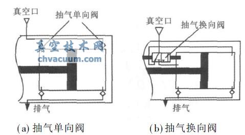 抽气控制阀的主要作用是切换真空腔室与真空口处的连接。在研究过程中曾经研究了如图2所示的抽气单向阀和抽气换向阀两种结构方案,它们都可满足基本的功能需求,但是在极限真空度的性能指标上有一定差异,对此分析说明如下。