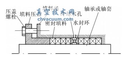 填料密封的原理: 密封填料装填在填料函内,填料密封是通过压盖螺栓施加在填料压盖上的预紧力,进而填料压盖作用在填料轴向压力,填料径向膨胀,使得密封填料的两个面分别和轴承或轴套和填料函的表面紧密贴合,从而形成密封。通常情况下盘根之间有水封环,水封环的上端是通入冷却水的冷却水孔。