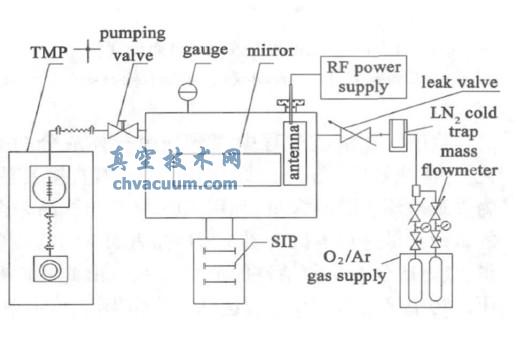 射频电气系统主要包括:射频电源,包括射频信号发生器和功率源以及匹配调节器; 安装于法兰上的,伸入所要清洗的光学元件所在真空室内部的铝制天线; 通过法兰上的电极引线,天线与供电电路连接,将射频功率耦合入腔体中。气路/ 真空系统主要包括: 氩气以及氧气气瓶,及对应的流量阀门; º液氮冷阱,用来去除混合工作气体中的水; 涡轮分子泵机组,用来抽出腔体中的气体,维持保持放电腔体中气体压力的恒定; 溅射离子泵,在清实洗验前后用于超高真空获得。射频等离子体放电电源采用中科院微电子研究所的SY500 型射频电源以及射频匹配器,通过调节射频功率输出和射频匹配,可将射频功率有效耦合入真空腔体中,从而在射频天线附近产生射频电场,产生等离子体而电离工作气体。为了利于进行气体放电,通过前期实验研究,选择工作气体为氩气与氧气的混合气体,混合气体的质量流量比为2B3,通过调节控制混合气体进入腔体的微调阀和控制分子泵机组抽速的抽速阀,将放电腔体内的压强控制在5~ 8 Pa 内。等离子体放电时的放电参数受到具体结构和气体压强的影响,通过调节功率和射频匹配,可以完成等离子体放电启动和放电参数的控制。气体成分的监测采用德国PFIFFER QMG 220 F1四极质谱完成。XPS 分析采用英国VG ESCALAB250 完成,真空度测量采用美国VARIAN 公司的MULTI-GAUGE。