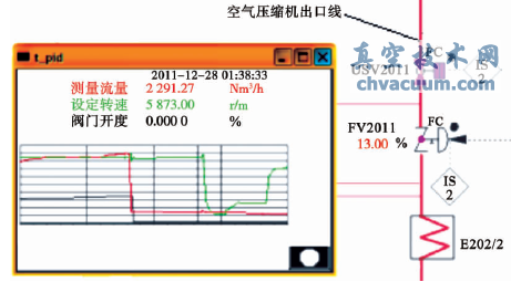 实际运行中,为防止压缩机喘振,同时在极端条件下能迅速全开喘振放空阀,压缩机喘振控制器要求设置在自动模式,根据AtlasCopco公司提供的压缩机使用手册可知,一段喘振流量设定值为3450m3/h,二段喘振流量设定值为1750m3/h,当压缩机流量大于喘振流量设定值时,喘振放空阀自动关闭,当小于喘振流量设定值时,喘振放空阀自动开启。