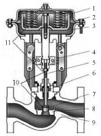 单座式调节阀整体结构如图1所示,主要由执行机构和调节机构组成。执行机构将控制器输出电流信号转换为调节阀阀杆的直线位移;调节机构通过阀杆与执行机构相连,并将位移信号转换为阀芯和阀座之间流通面积的变化,从而改变流经阀体的流体运动状态。为了使阀芯和阀座之间的开度稳定在某个特定位置以保证实现控制器所要求的目标状态,调节阀设有阀门定位器附件,组成以阀杆实际位移为测量信号、以控制器电流输出为设定信号的反馈控制系统。