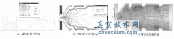 原有小型化行波管采用三级降压收集极,总效率35%。为保证本项目行波管效率达到40%,改用四级降压收集极。图3是四级降压收集极的初步计算结果,其中图3(a)是MSDC软件的仿真结果,图中电极之间的平行线及其延伸的淡色线是等电位线,其余的淡色线与深色线是原电子轨迹与次级电子的轨迹,原电子轨迹都从收集极入口出发,次级电子轨迹都在收集极电极边界与原电子轨迹相连。其降压效率为75.9%。图3(b)是TWTCAD软件对降压收集极的中频计算结果,图3(c)是MTSS降压收集极的三维中频计算结果。