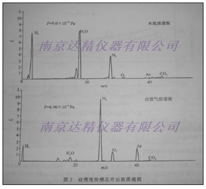 图2是硅惯性传感芯片出放质谱图。图中质量数为28、32和40处有三个较大的峰,说明样品放出大量的氮气、氧气和氩气,这与我们在样片加工过程中大量采用这三种气体有关。由于氩气是惰性气体,很难用一般的吸气剂进行吸附处理,建议进行预烘烤,并用氮气进行冲洗处理。