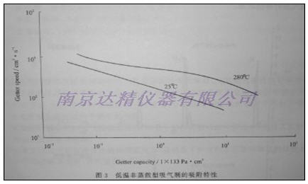 图3是吸气剂的吸附特性。说明在进行一定的处理工艺后,这种吸气剂将有较好的真空维持特性。试验气体是氢气,吸气剂上恒定压力为6X10-4Pa,试验流导为37.1cm3s-1, 吸气剂表面积为100mm2。