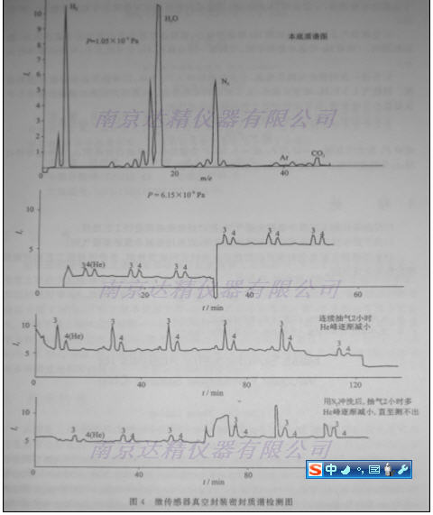 5.为进一步判断有无漏空现象,向真空系统冲入N2气体,以冲洗样品室和微传感器表面。再抽气2.5h,He峰逐步减小,直至减弱到无法测出。从而可判断微传感器的漏率小于仪器最小灵敏范围,也可说明封装工艺与结构是成功的。