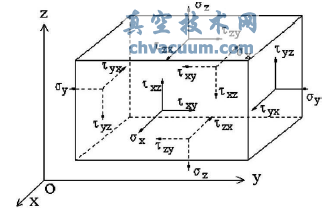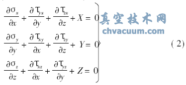物体受到热胀冷缩与受拉、压作用下的弹性伸缩极其相似,在弹性极限内,当作用力消失时物体能恢复原状而无残余变形以及物体的变形与受力大小成正比,这种现象在热变形过程中也同样存在,在一定条件下,热变形也存在线性的关系。本文进行的热应力分析属于静态热应力分析,设X,Y,Z为体积力分量时,微元体的静力平衡方程为: